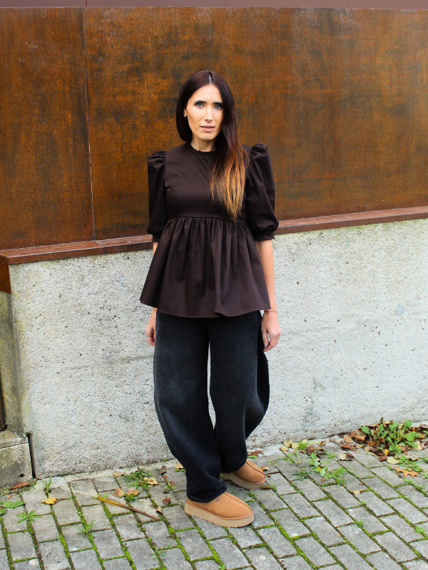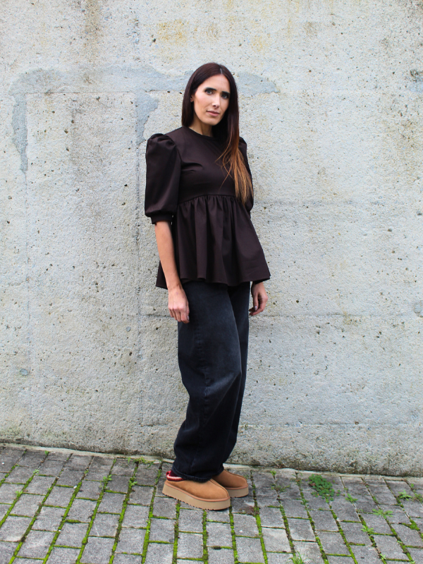 Blusa corte princesa assimétrico com folho franzido. Abotoa com 5 botões grandes forrados nas costas.