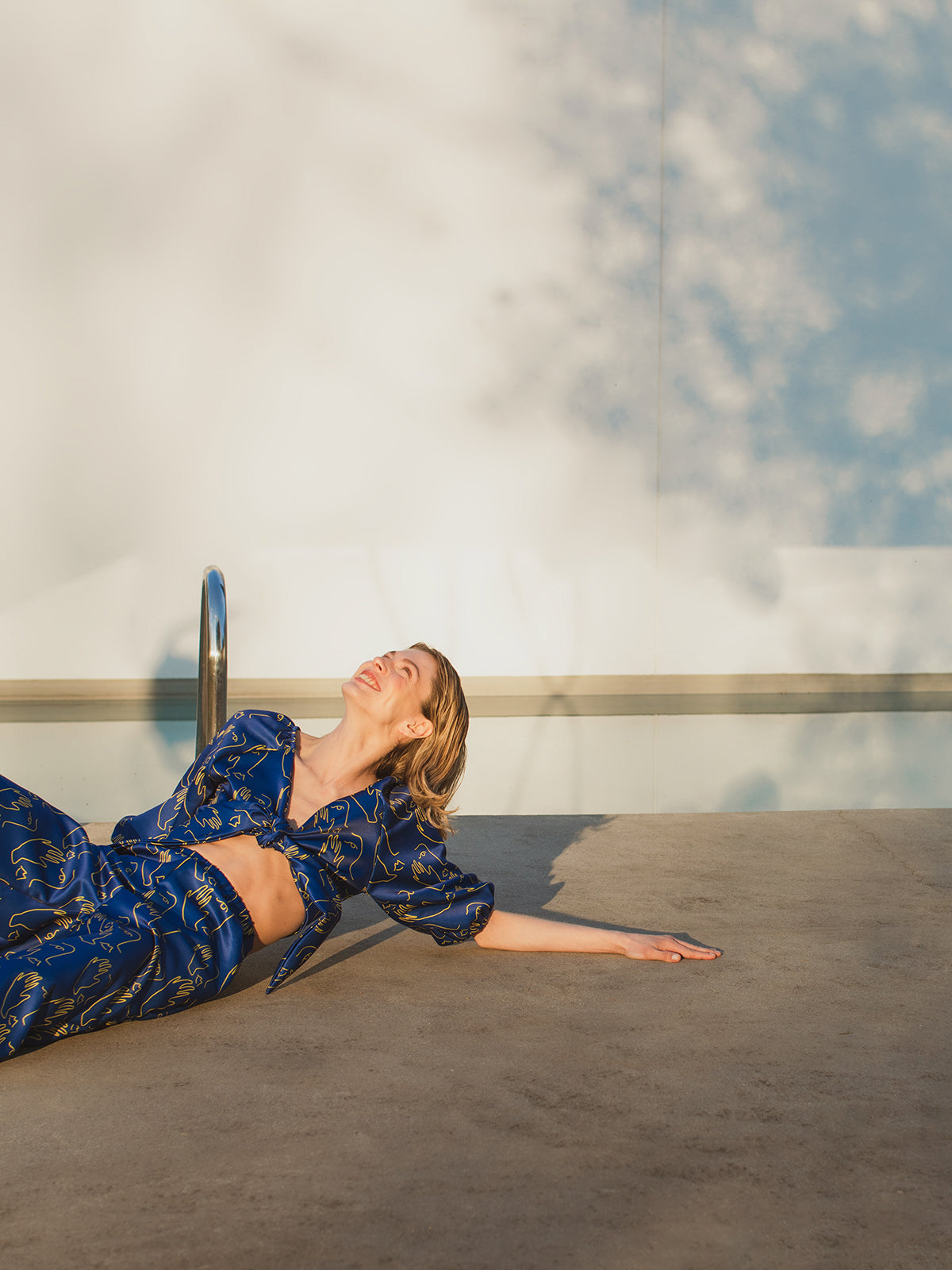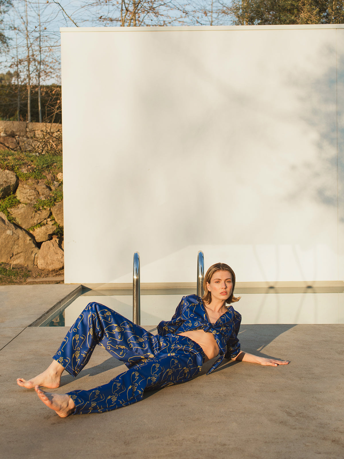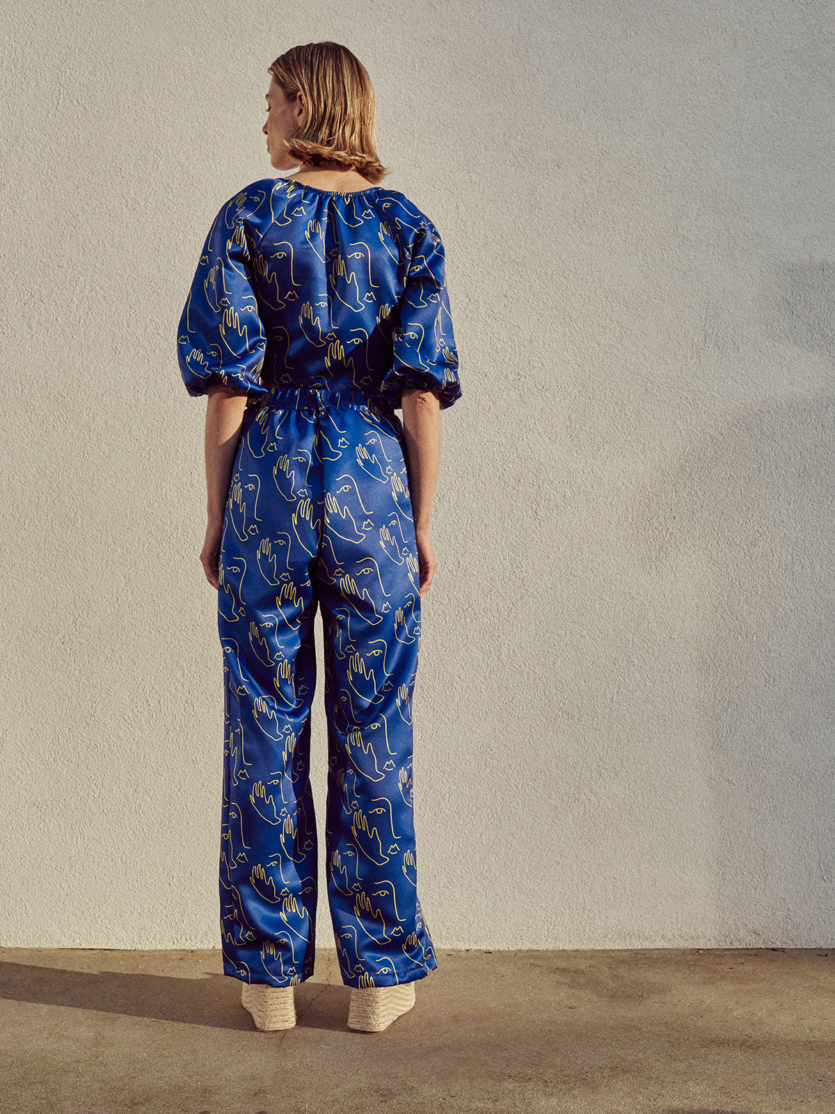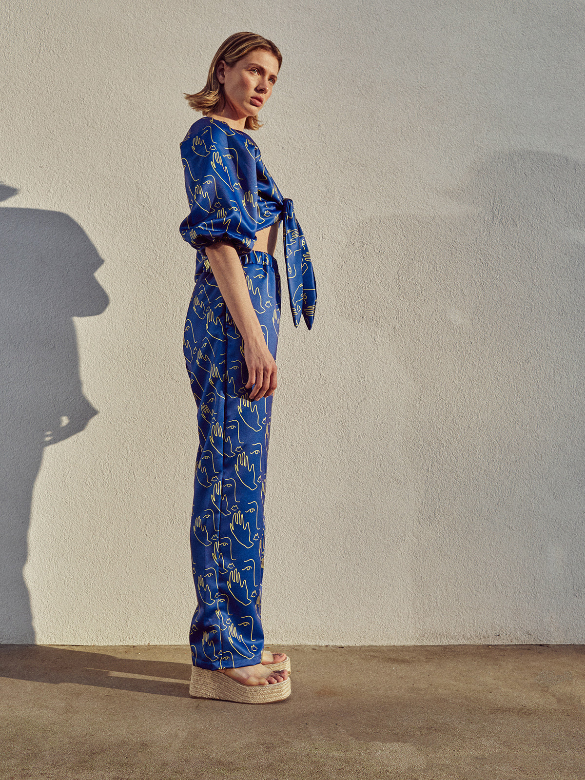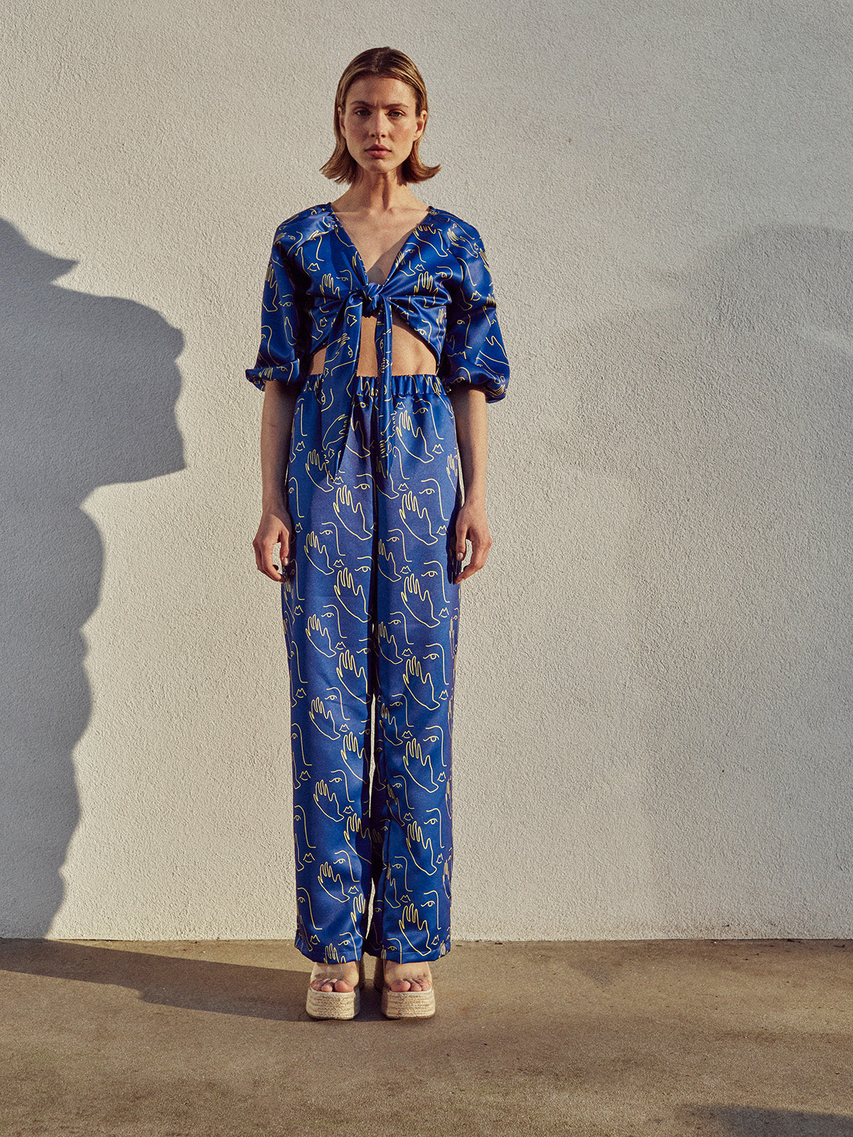 Calça estilo kimono com elástico na cintura e bolsos laterais.