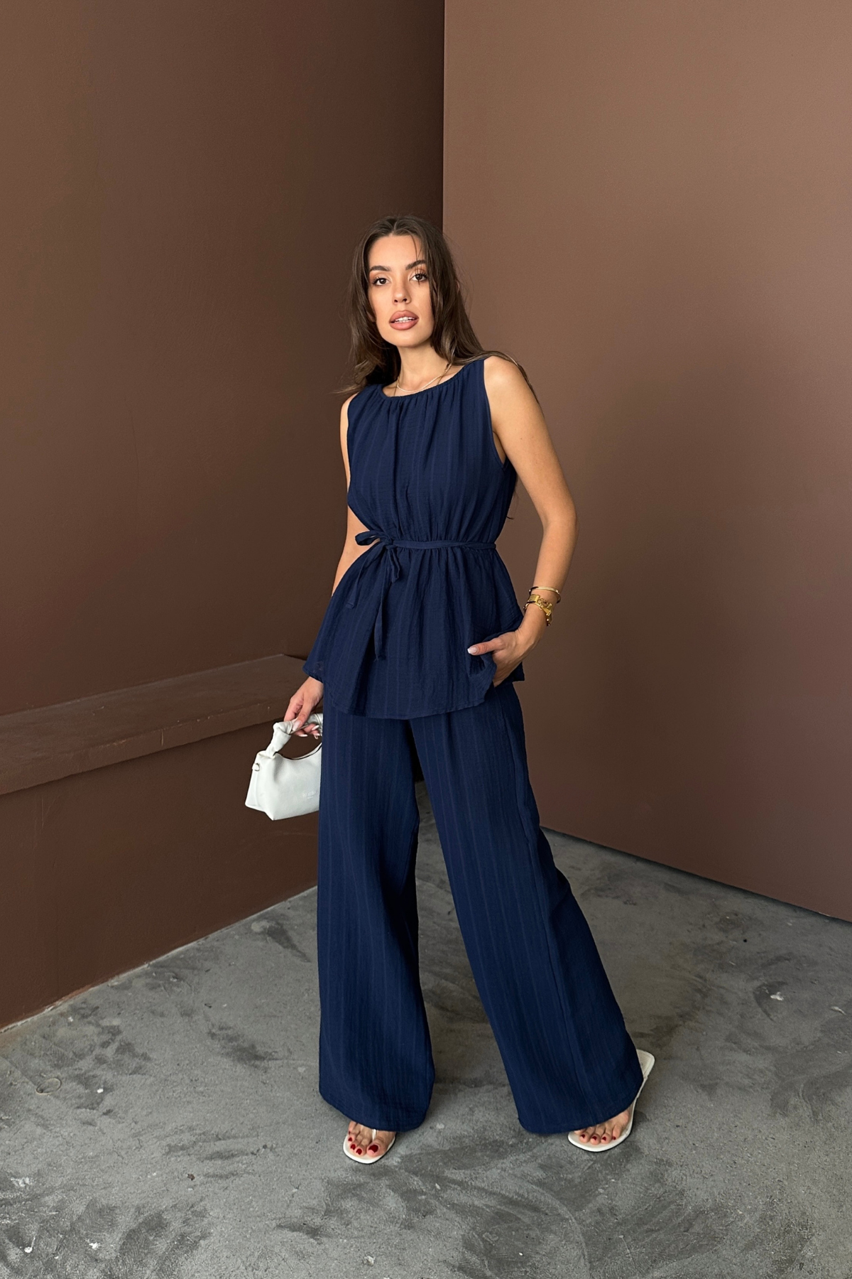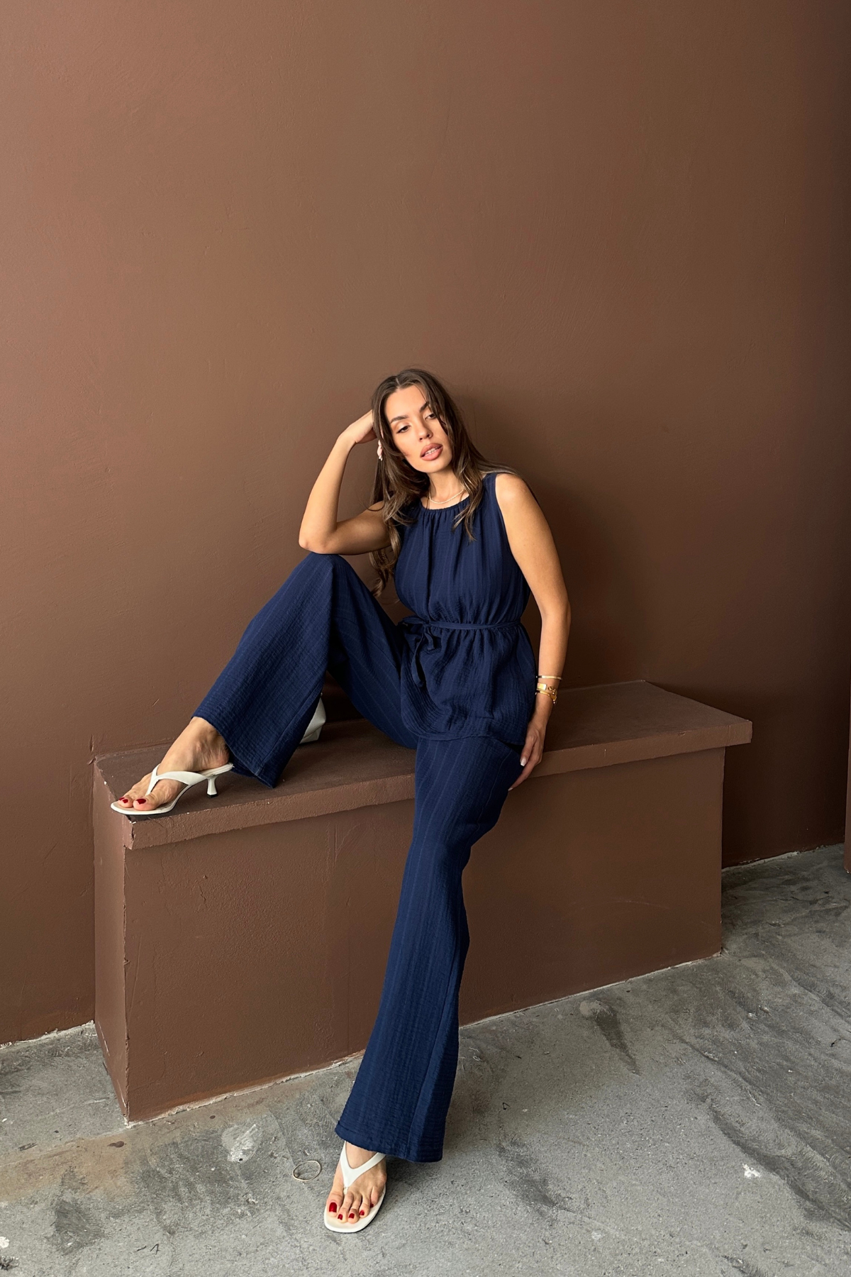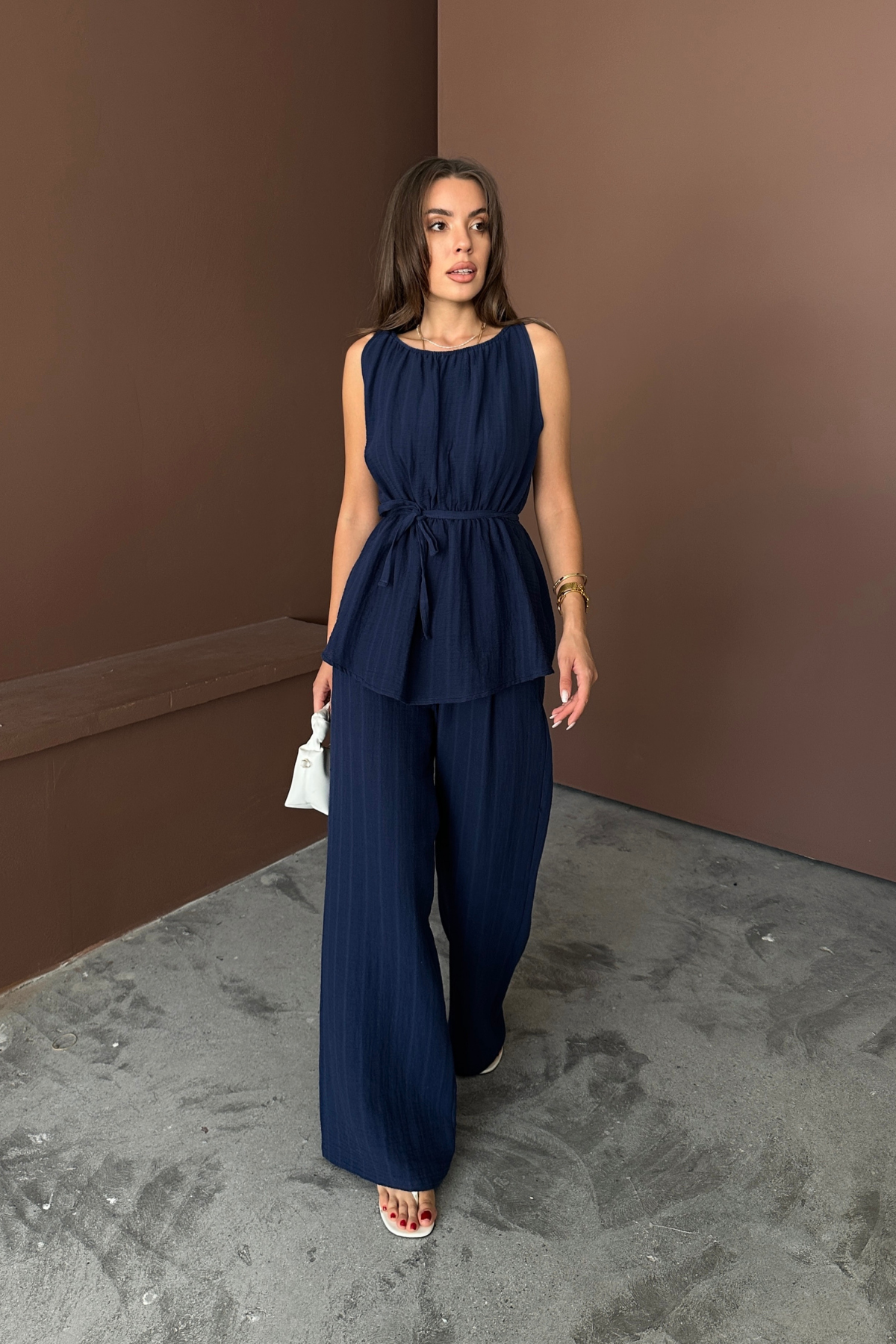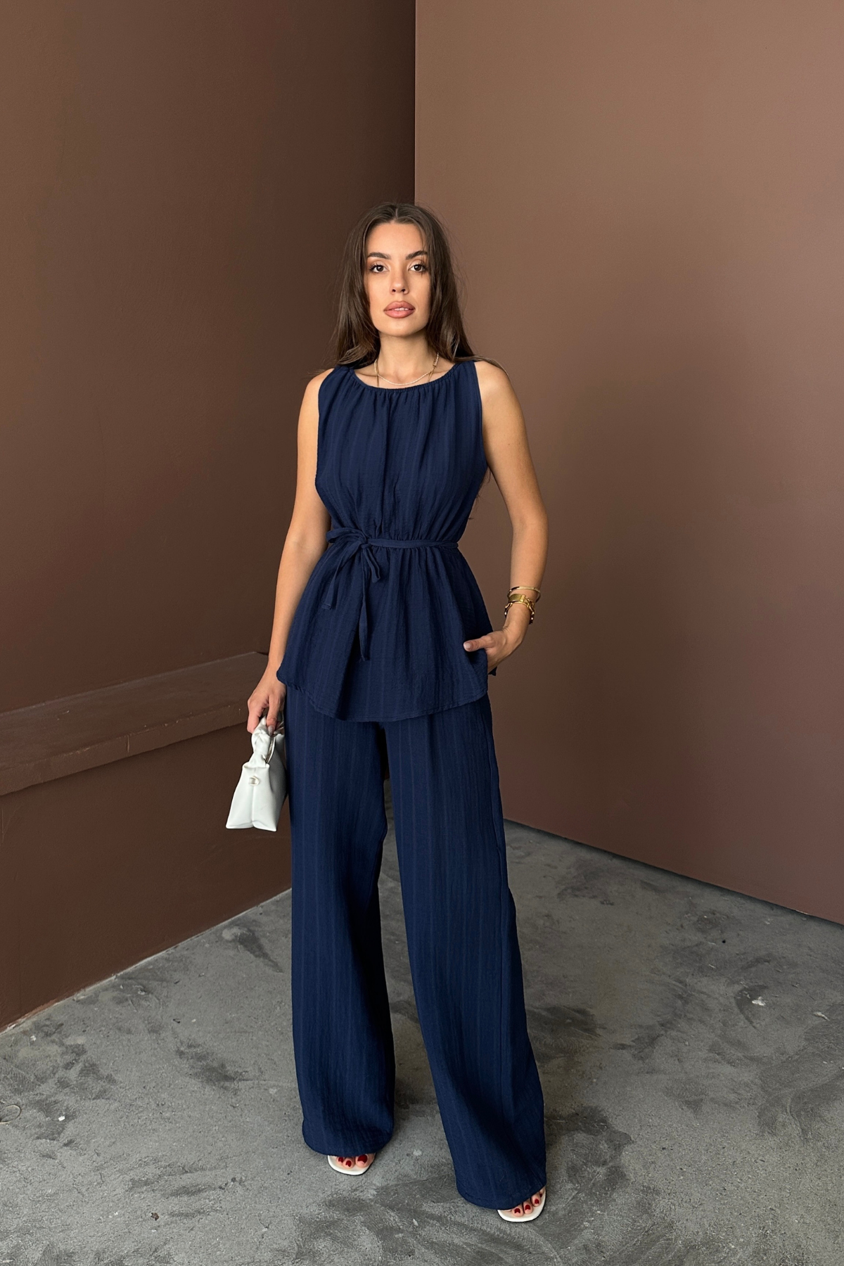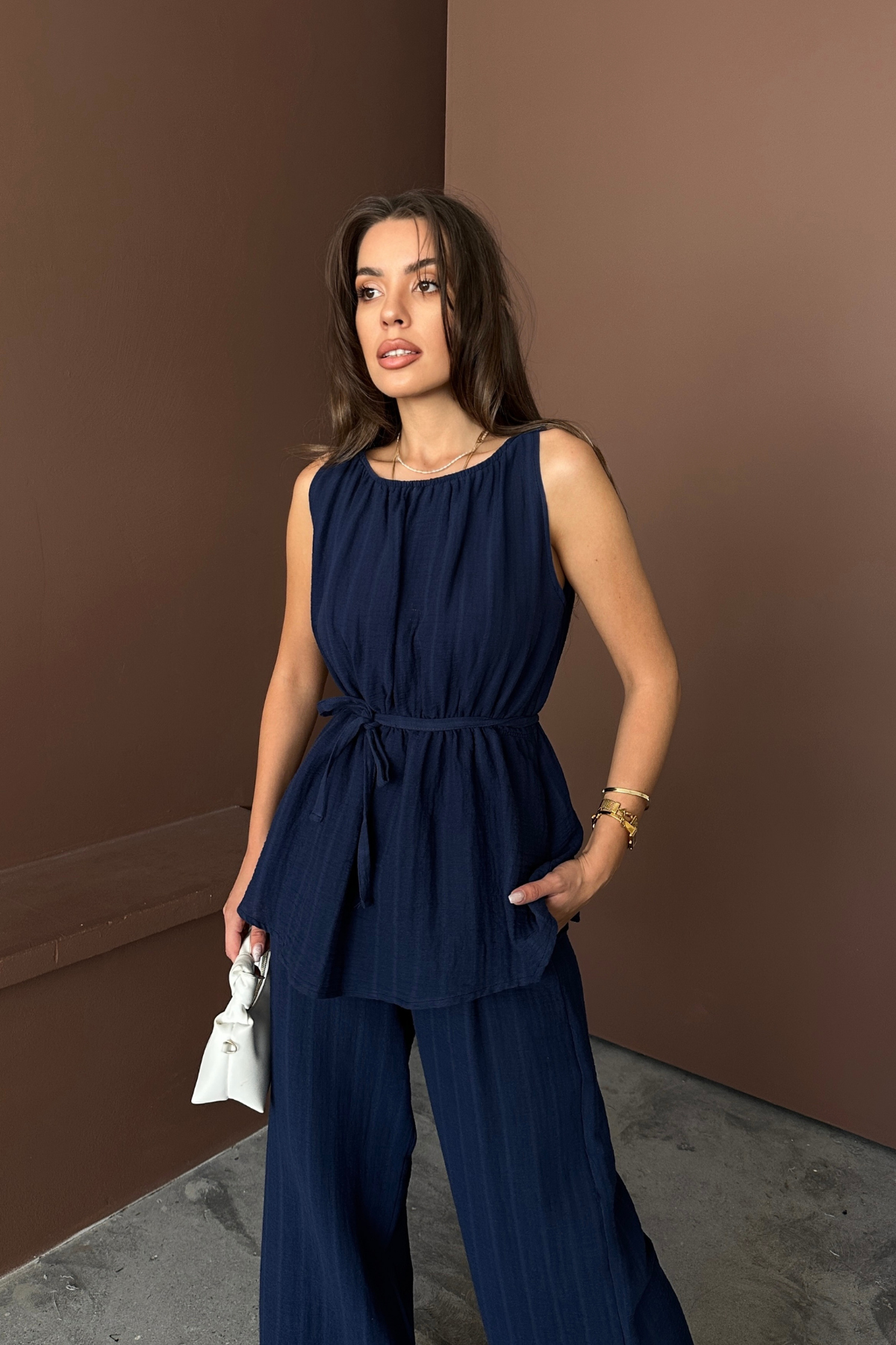 Blusa sem manga com elástico na cintura. Pode usar com cinto no mesmo tecido. e Calça palazzo de cintura subida com elástico e bolsos laterais.