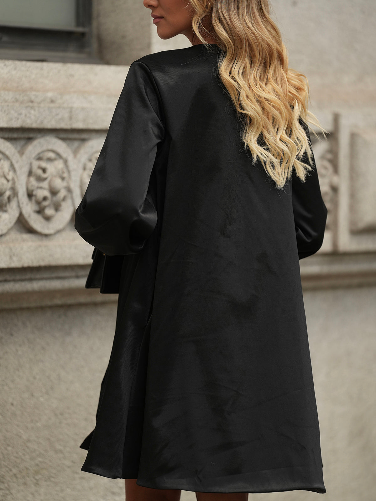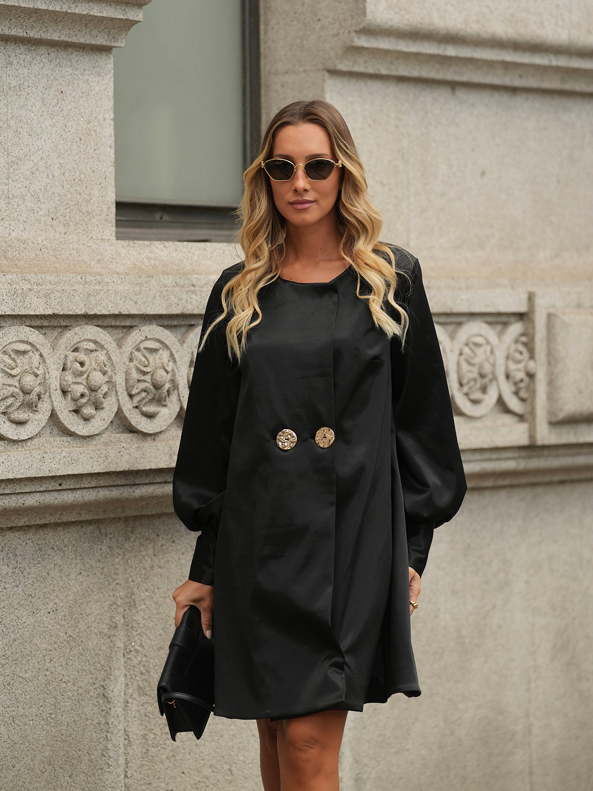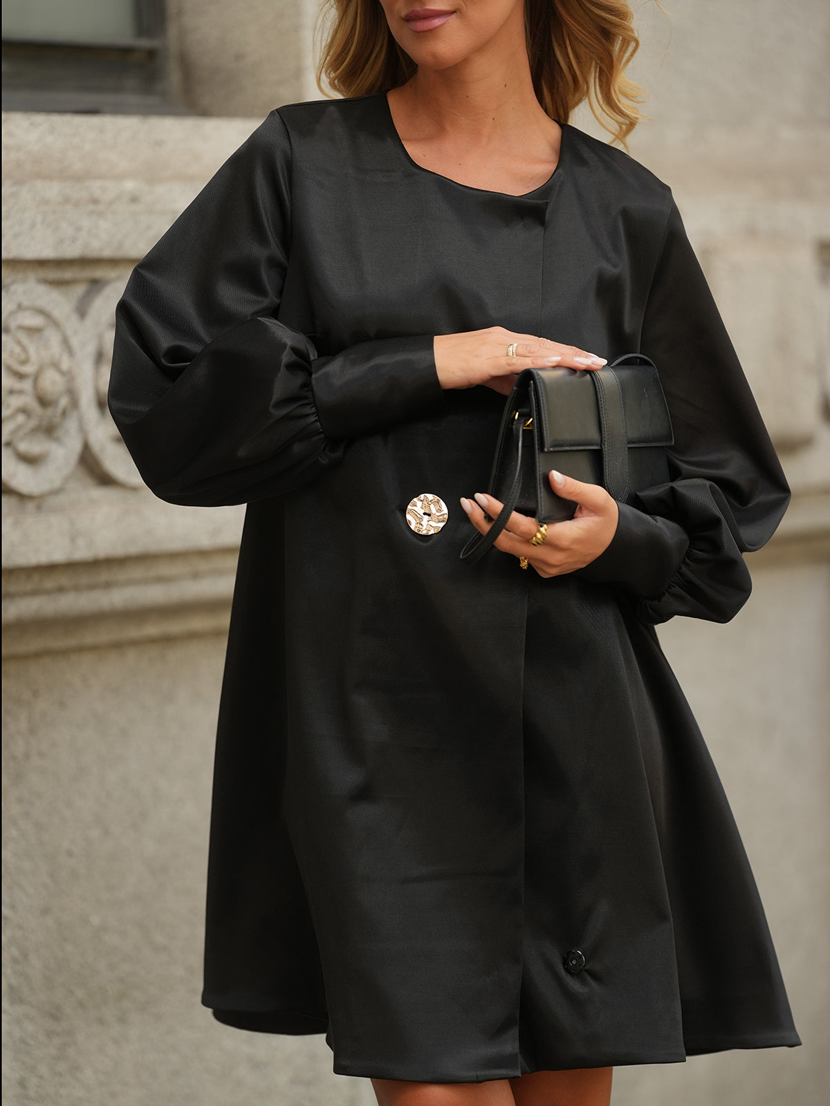 Vestido midi de decote redondo tipo colete. Abre totalmente a abotoa com dois botões metálicos prateados e uma mola na gola. Manga comprida com punho alto.