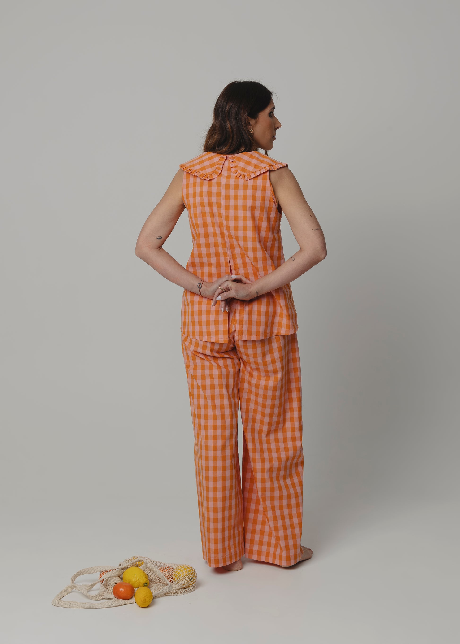 Blusa corte godé sem mangas. Gola peterpan na frente e nas costas.