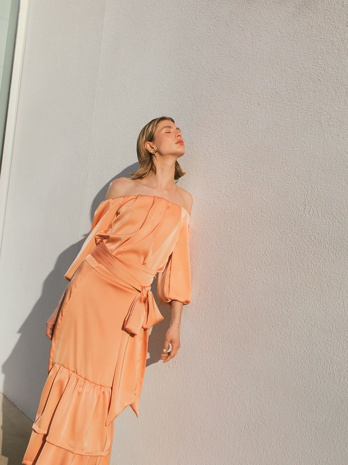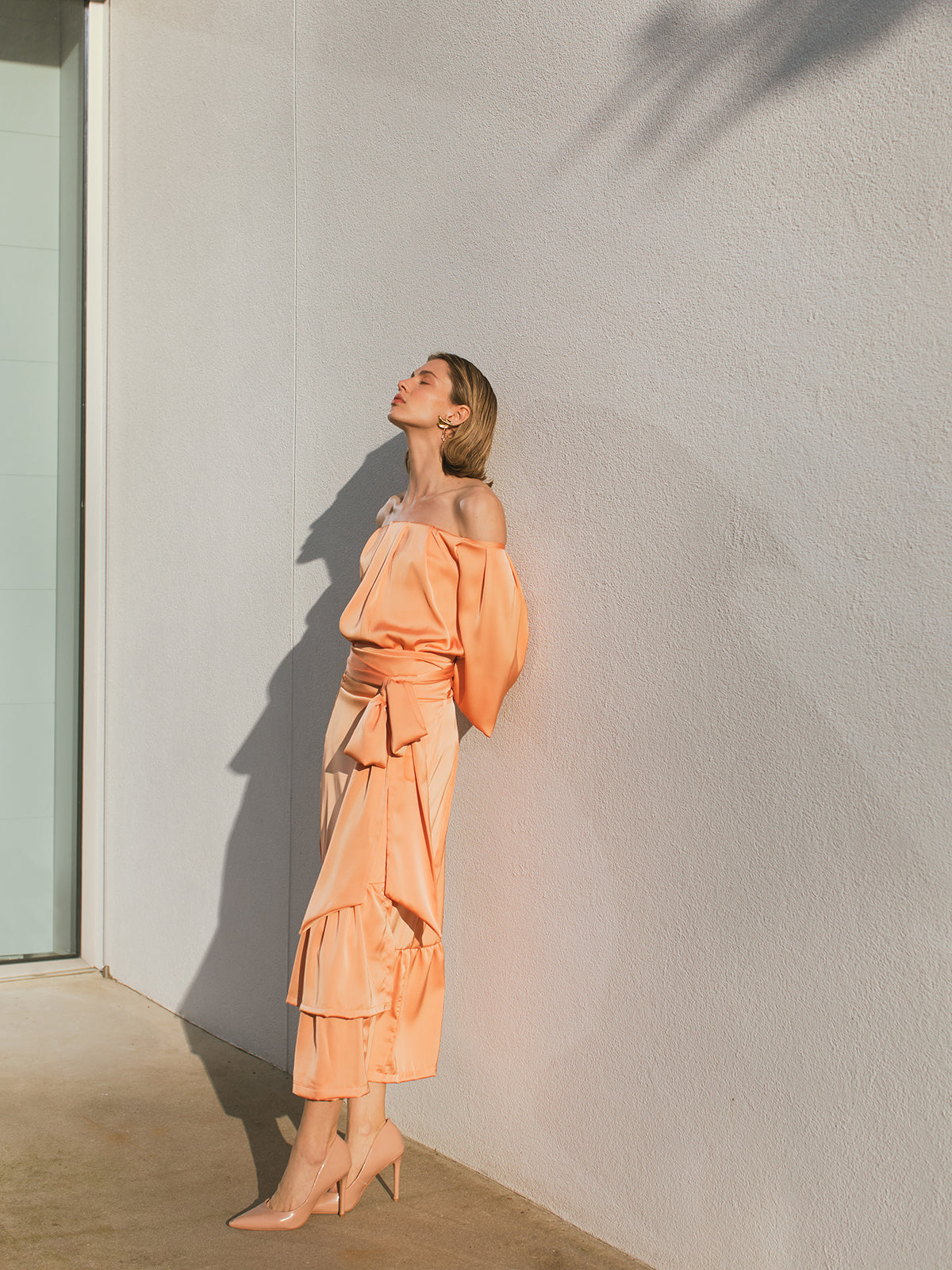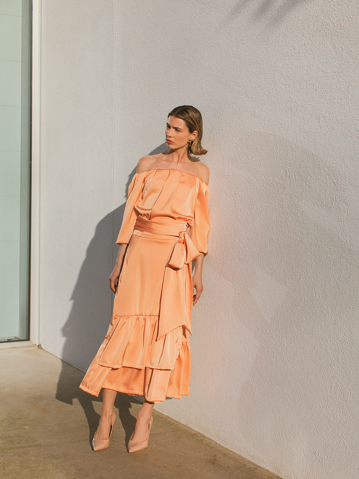 Saia de trespasse com folho duplo e grande laço na cor Sand.