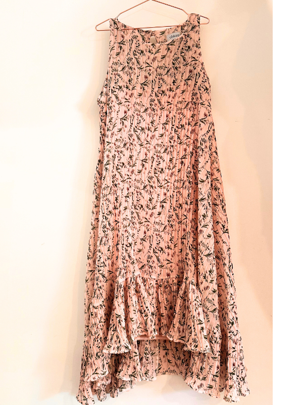 Vestido maxi, sem manga, com folho drapeado em abaixo. Bastante fluído, aperta atrás com um botão forrado no mesmo tecido.
