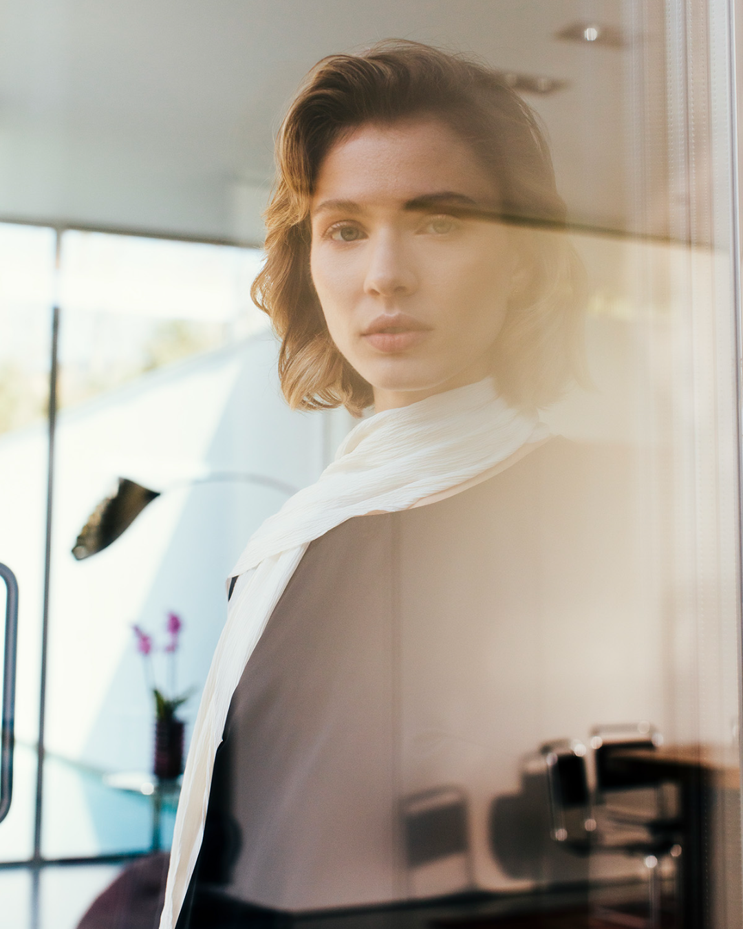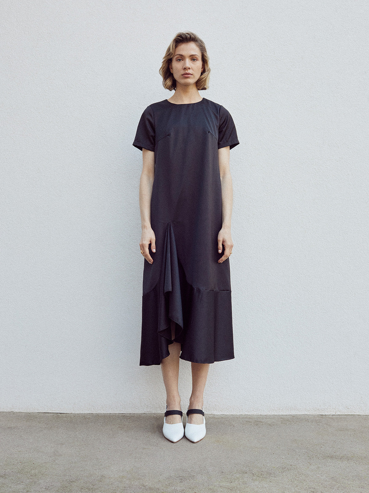 Vestido midi fluido, de meia-manga, com folho drapeado. Aperta atrás com laço. prega no decote.