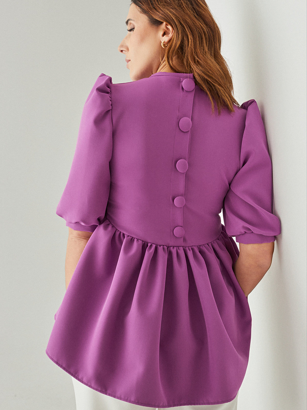 Blusa corte princesa assimétrico com folho franzido. Abotoa com 5 botões grandes forrados nas costas.